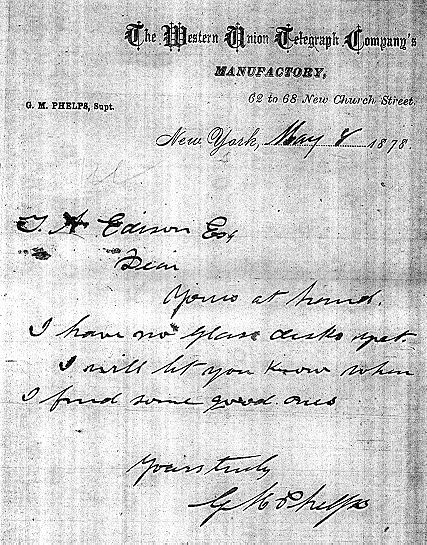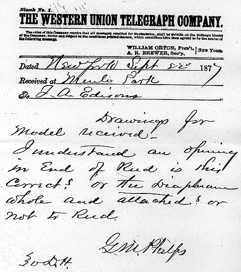 In the document below, Phelps is responding to a request by Edison for the status on glass disks. These disks were used in the construction of the Edison Carbon Telephone Transmitter. ![]() " T. A. Edison Esq Dear yours at hand, I have no glass disks yet. I will let you know when I find some good ones. Yours truly G M Phelps In September of 1877, Thomas Edison gave Western Union drawings of a telephone from which a patent model was to be constructed by George Phelps. In the telegram shown below, Phelps is asking Edison for clarification on one of his instructions. ![]() New York Sept.22 1877 Menlo Park T A Edison Drawings for model received. I understand an opening in end of reed is this correct? or the diaphram whole and attached ? or not to reed. G. M. Phelps |